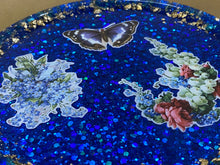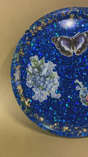 Made with resin with added blue glass, gold leaf, flower & butterfly pictures, w/ blue back with blue glitter