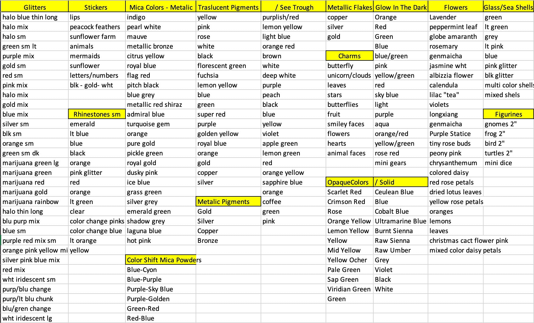 Pick hardware color, color(s), glitter charms or flakes if wanting, solid or translucent or mica color & if wanting colored at all on the outside.