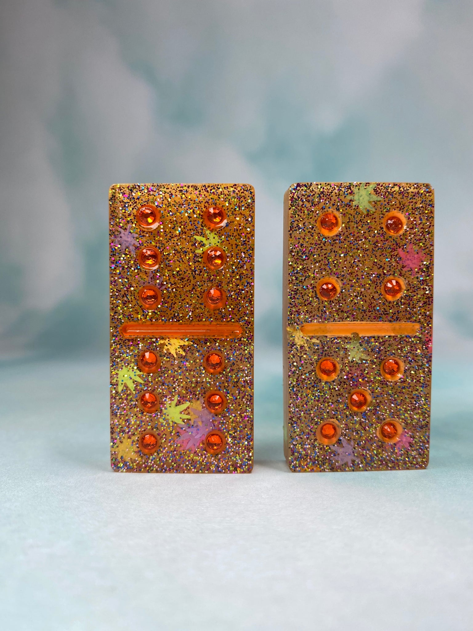 This set is rainbow glitter w/multicolor "happy leaves" front with mica orange back with rhinestones in all dots