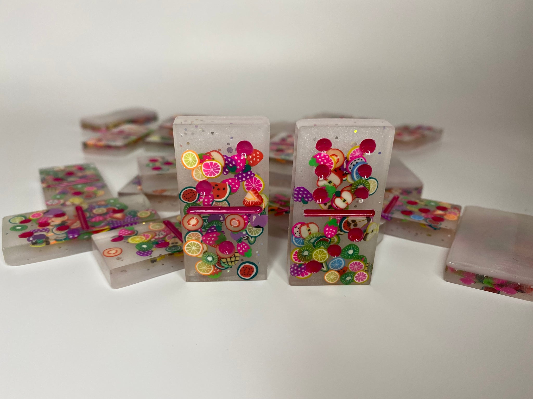 Double six domino set of 28 is clear with fruit charms on front with pearl white with holo glitter back