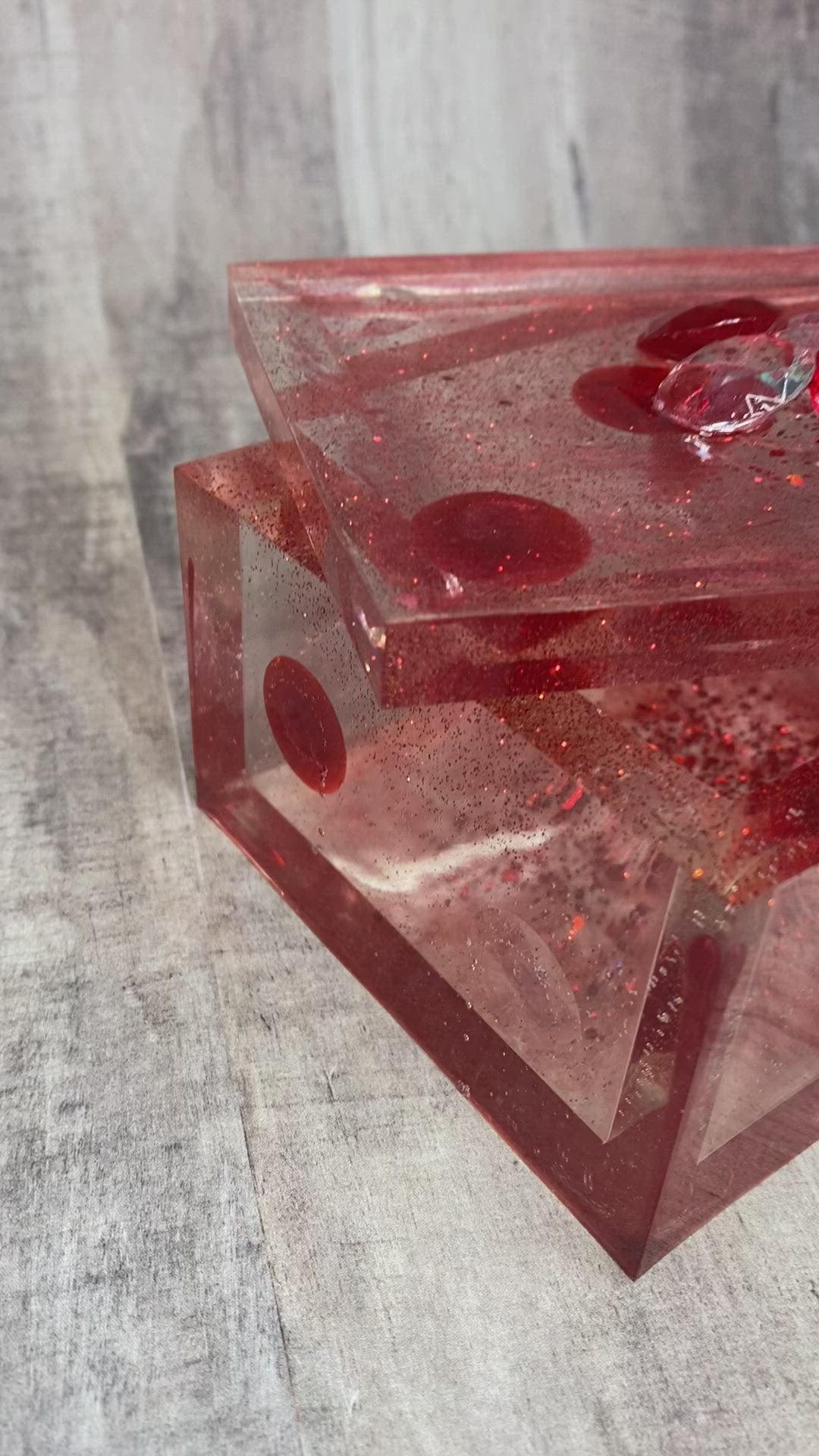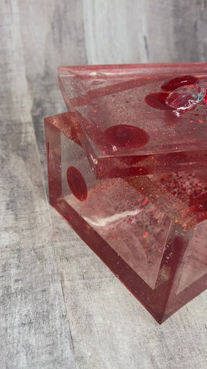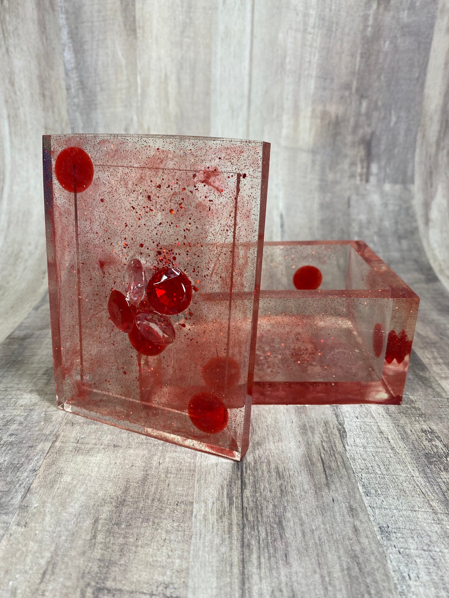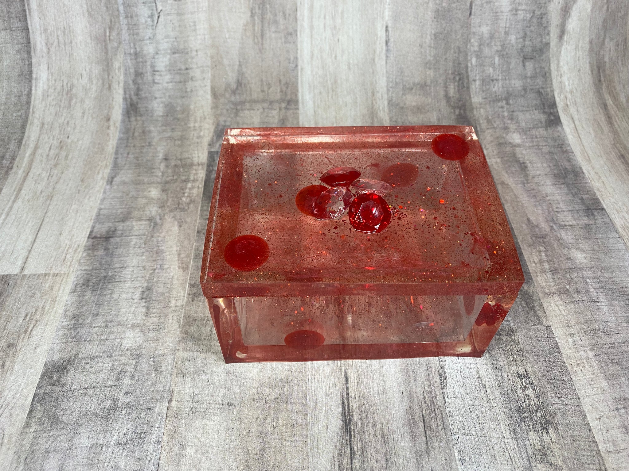 Has red & clear gems pieces on top & in the resin in the lid & around the sides of the box