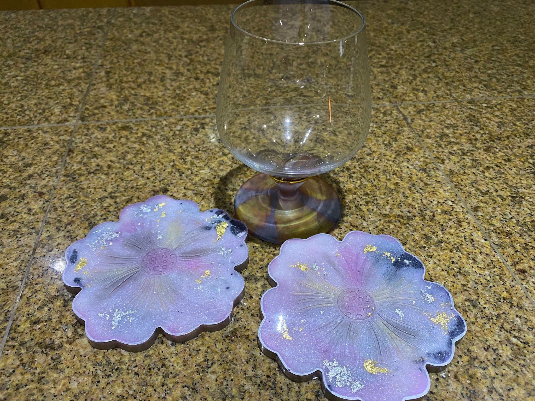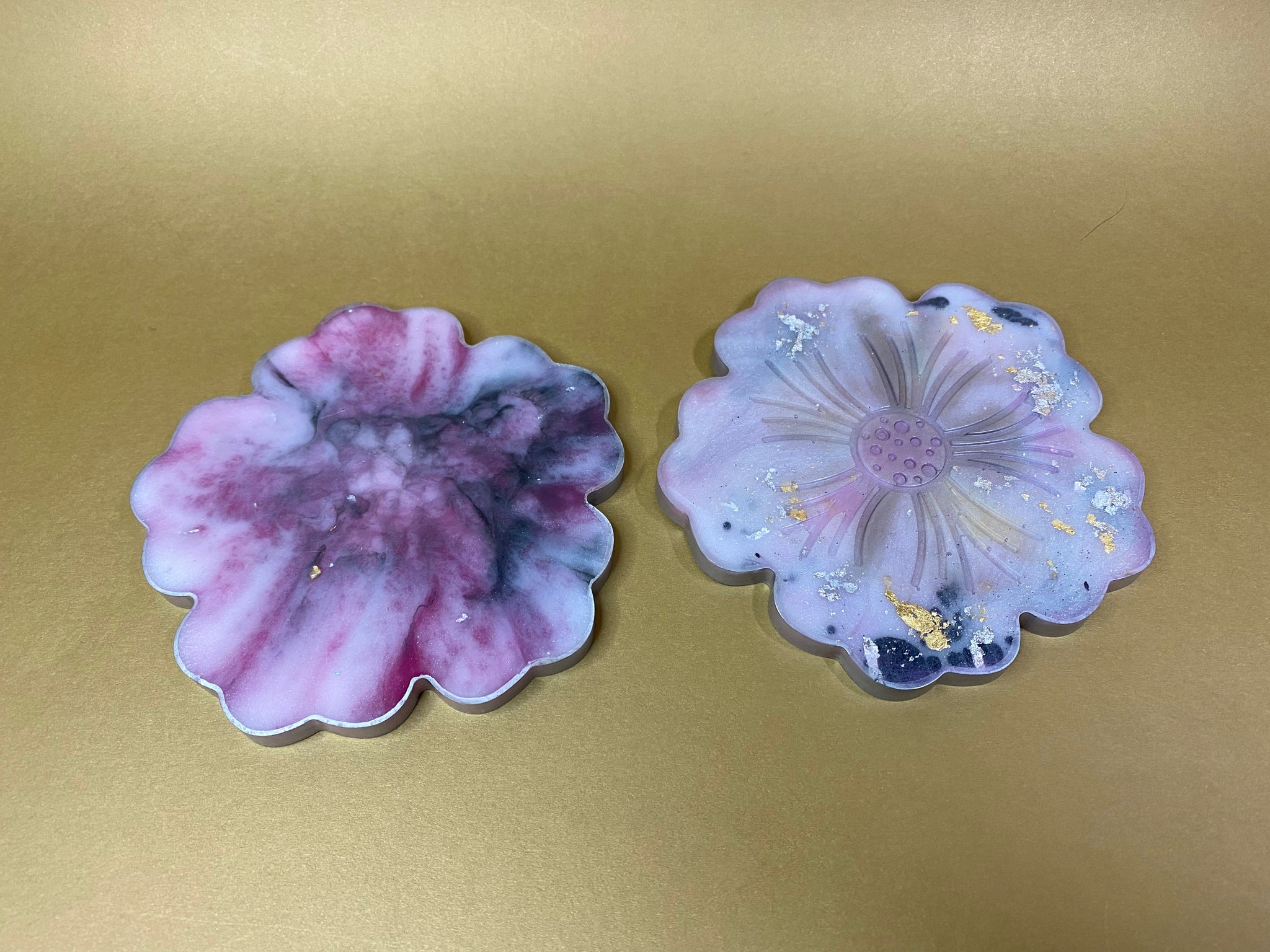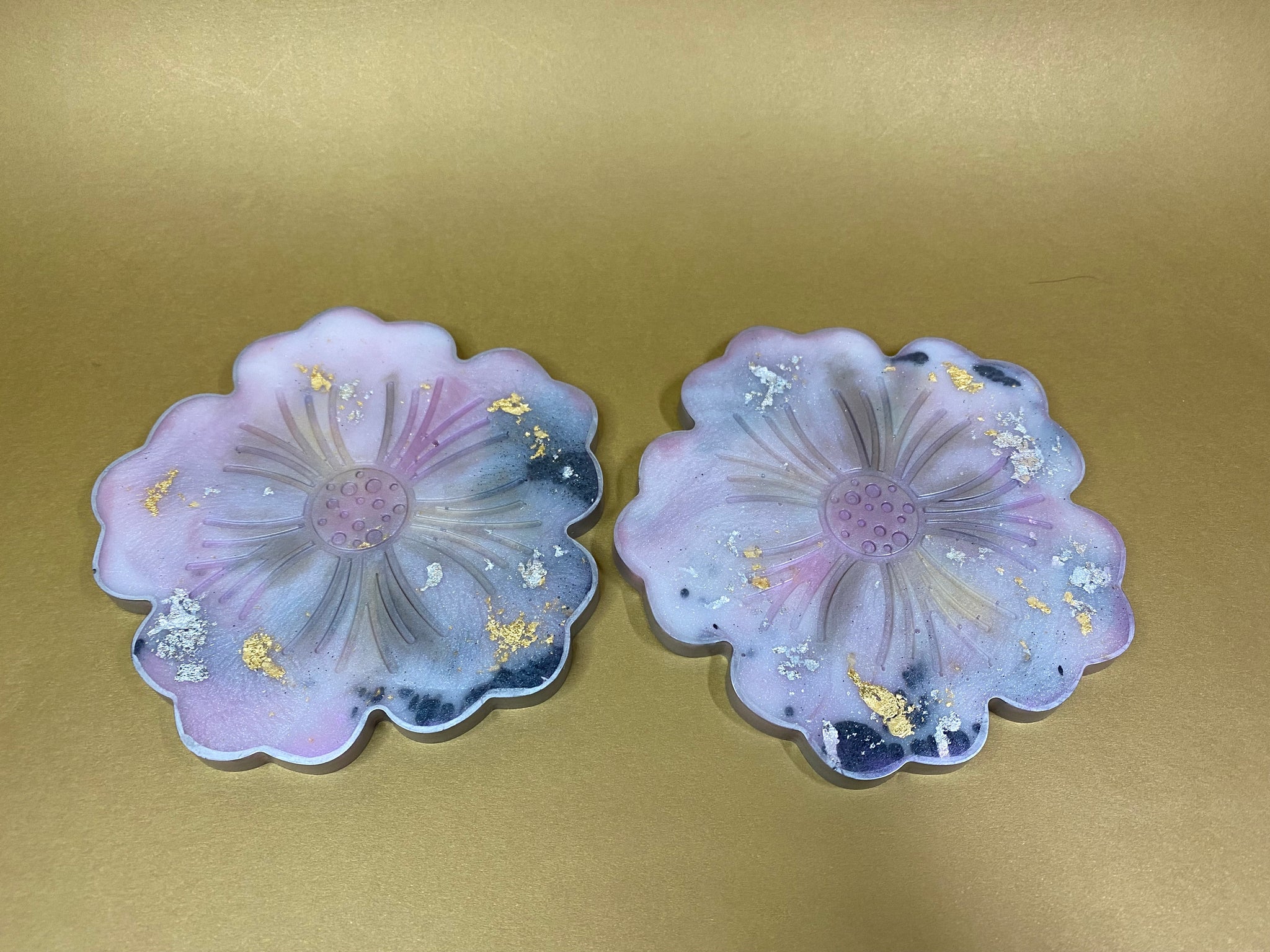 Set of two resin pink marble looking coasters with gold & silver flakes