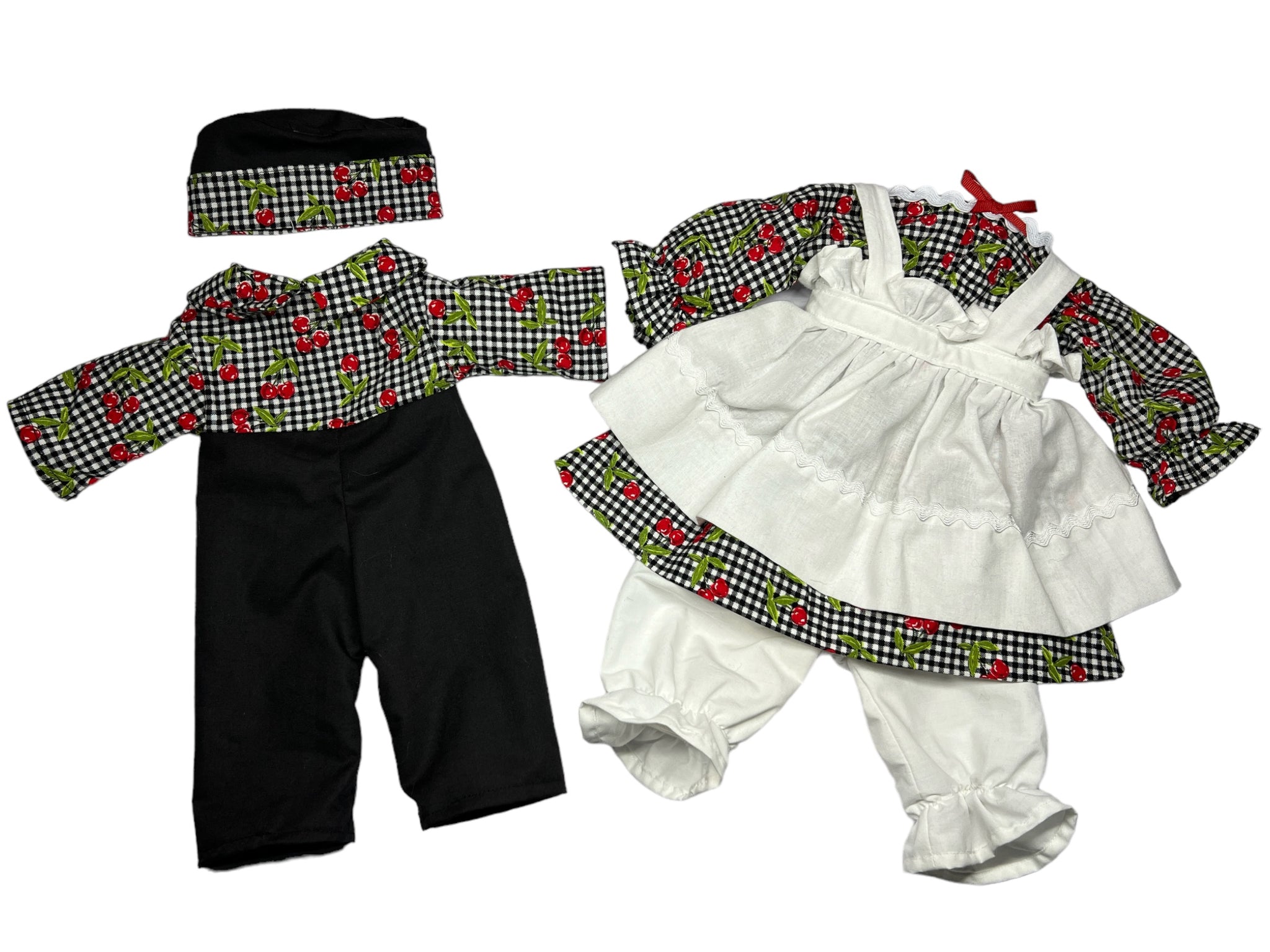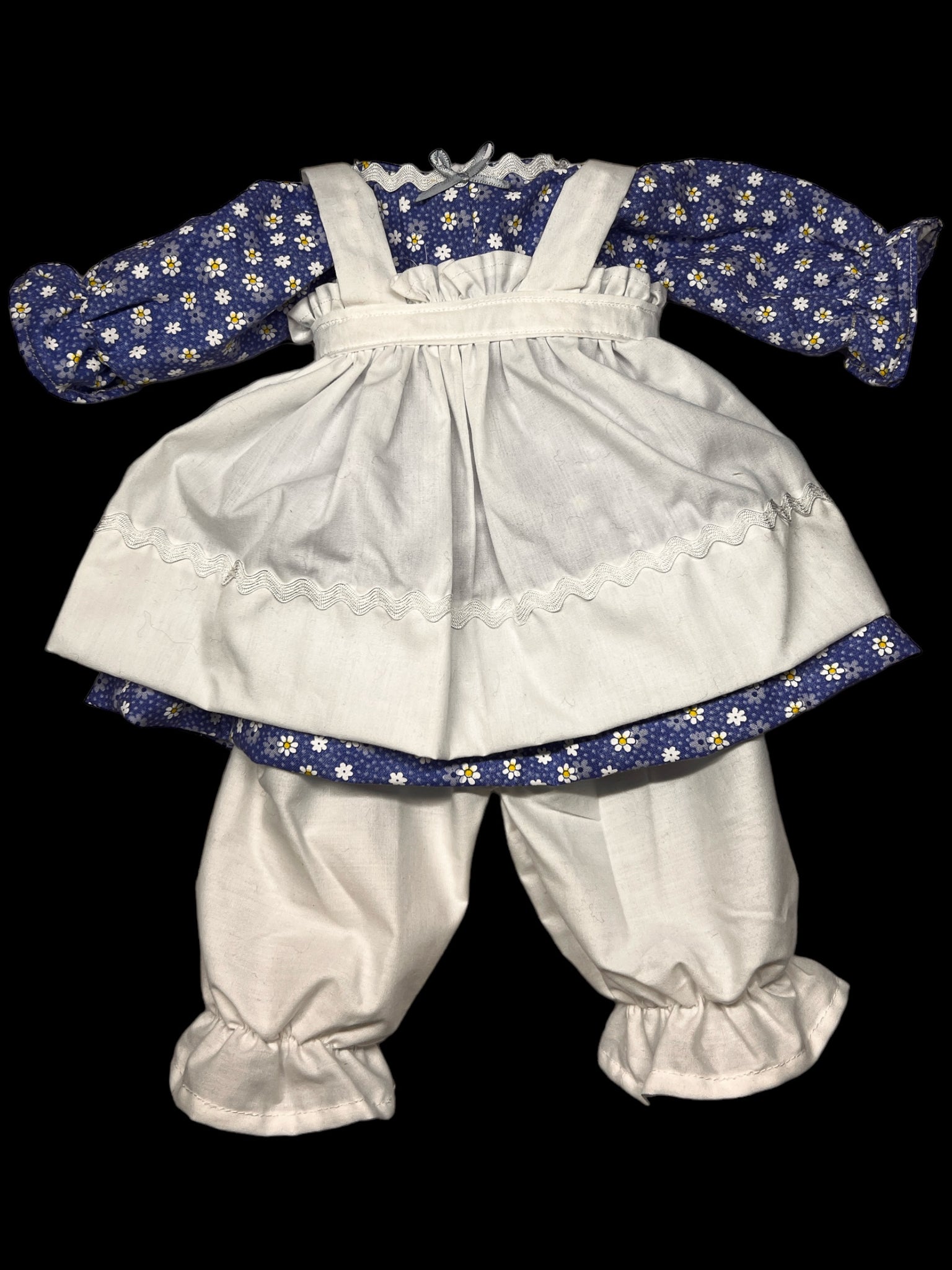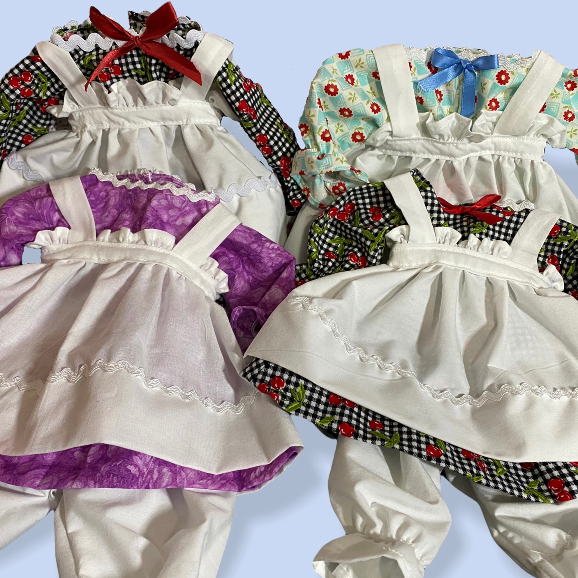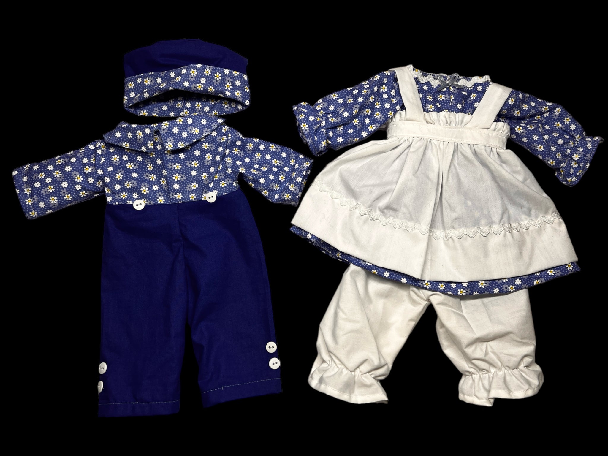 It's best (but not necessary) to contact me before ordering with fabric choice(s) if you wanting a custom clothes look and are not sure. You'll have to pick colors/pattern for the dress, bloomers, & apron for girl, or for boy pant color & shirt color or pattern (hat will match), or if wanting a more traditional look for girl list white for apron & bloomers & then your choice of dress fabric or for boy lost pant color & shirt pattern. I will also need your custom dolls neck measurements to insure a proper fit.