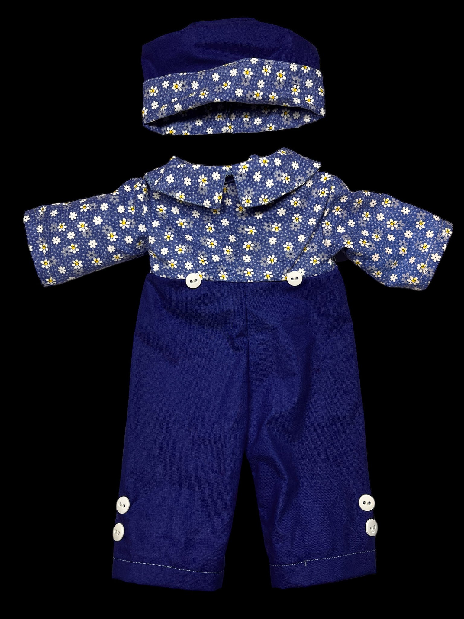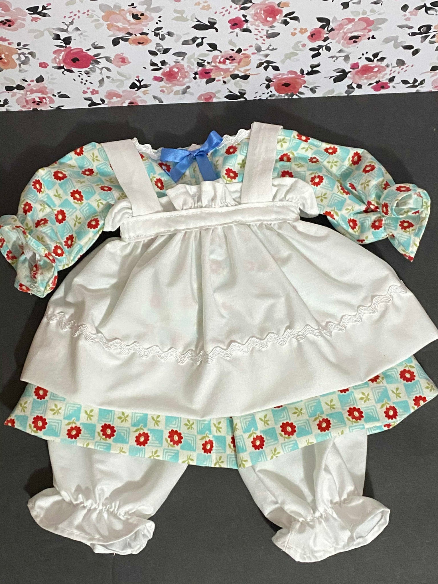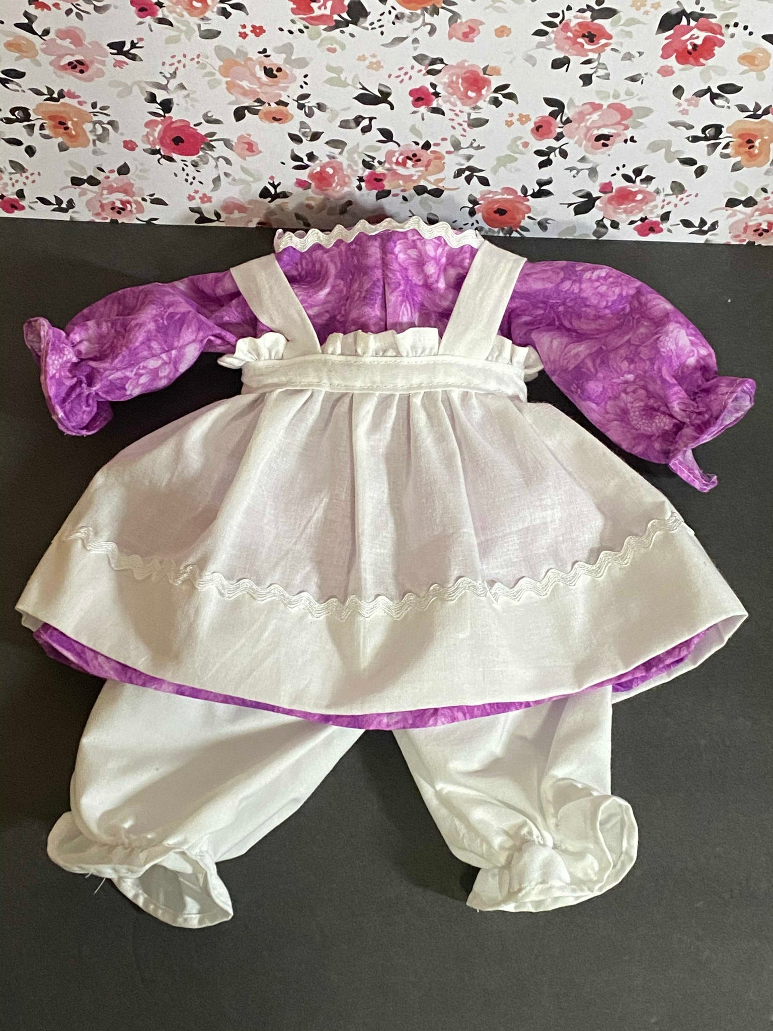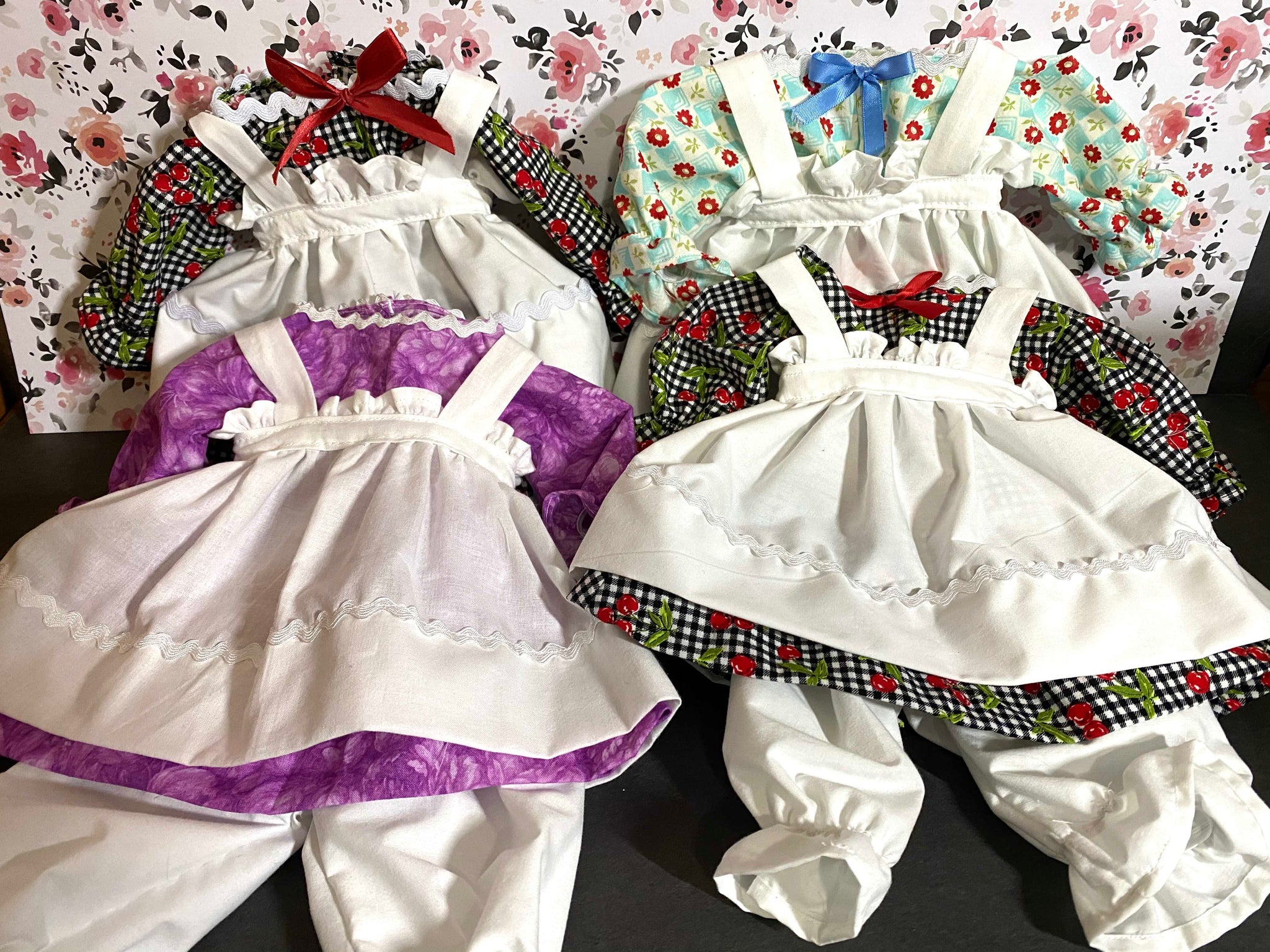 It's best (but not necessary) to contact me before ordering with fabric choice(s) if you wanting a custom clothes look and are not sure. You'll have to pick colors/pattern for the dress, bloomers, & apron for girl, or for boy pant color & shirt color or pattern (hat will match), or if wanting a more traditional look for girl list white for apron & bloomers & then your choice of dress fabric or for boy lost pant color & shirt pattern. I will also need your custom dolls neck measurements to insure a proper fit.