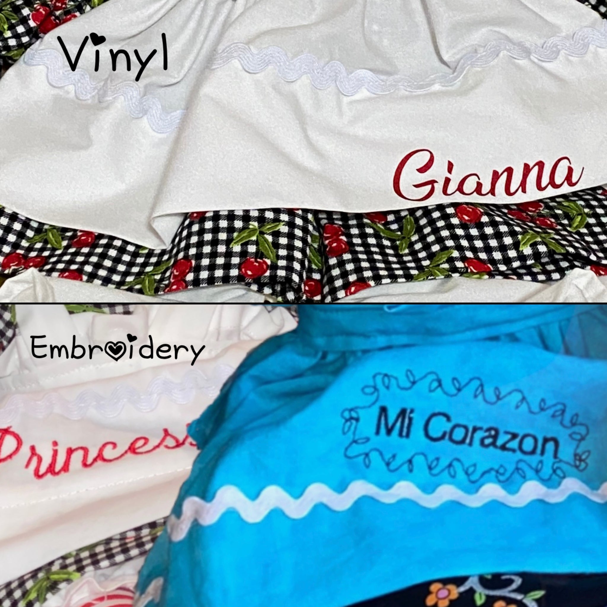 Add on customizations you can add name or short saying on apron for girl or on boy pants or hat, in vinyl or embroidery. Make sure and add this to your cart with your purchase as it is an additional charge.